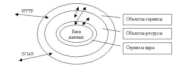 На самом нижнем уровне находятся сервисы функционального ядра портала. Сюда относятся, например, механизм хранимых объектов, исполнитель запросов Object Query Language и другие сервисы, абстрагирующие доступ к базе данных. Эти сервисы используются объектами, представляющими информационные ресурсы, такие как "организация", "персона", "публикация", "web-страница" для извлечения и модификации своих данных [3]. Помимо объектов-ресурсов, существуют объекты-сервисы, например: сервис визуализации, поисковый сервис, подписка на уведомления о модификациях. Эти объекты используют, помимо сервисов функционального ядра, объекты-ресурсы для реализации своей функциональности.