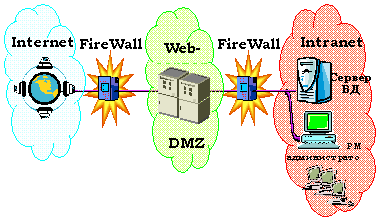 Имеющаяся на сегодняшний день реализация Информационного Web-портала развернута на аппаратно-техническом комплексе, включающем четыре сервера и рабочее место администратора (рис.2). Два брандмауэра (Firewall) позволяют организовать демилитаризованную зону Интернет, в которой установлен Web-сервер, и защищенную зону, в которой установлен сервер баз данных и рабочее место администратора. Отметим, что имеющаяся топология допускает в дальнейшем легкое наращивание.