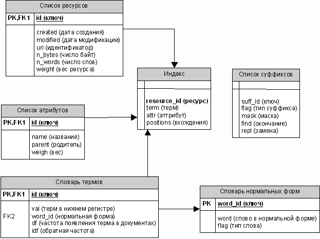 На данной ER-диаграмме представлены таблицы, используемые для хранения индекса и сопутствующей информации. Сервис индексирования позволяет создавать несколько групп индексов, при этом для каждой группы форми-руется свой набор таблиц. Таблицы термов, нормальных форм и суффиксов являются общими для всех групп индексов. Схема достаточно проста, за исключением частей, поддерживающих процессы нормализации слов и ранжирования ресурсов.