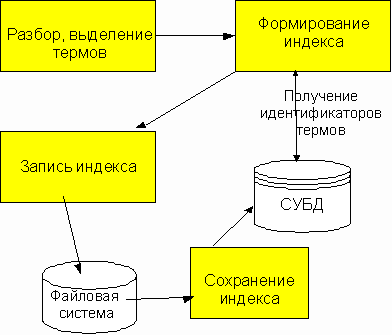 База данных задействована при формировании индекса и при его сохранении. В первом случае она используется для идентификации термов по словарю. Словарь пополняется новыми словами, когда обнаруживается, что какой-то терм отсутствует в словаре. Поскольку процесс сохранения индекса в БД медленнее процесса его формирования, процессы были разделены, и было обеспечено их параллельное функционирование с синхронизацией через файловый буфер.