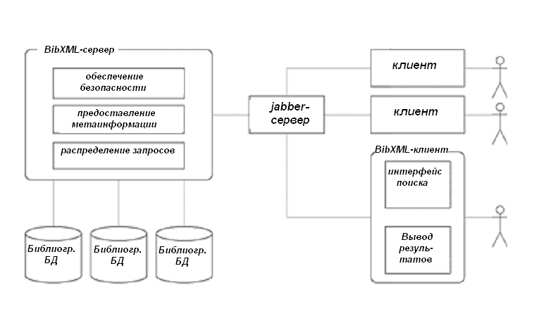 Описанные подходы были реализованы в виде системы, обеспечивающей поиск и передачу библиографической информации. Эта система может рассматриваться в качестве прототипа для исследования возможностей создания более сложных систем с использованием вышеназванных технологий. Как показала практика, использование в качестве транспортного уровня XMPP/Jabber значительно упрощает построение подобных систем и предоставляет достаточно много дополнительных возможностей по сравнению с другими известными подходами. В частности, разработанная концепция системы позволяет в дальнейшем легко наращивать функциональность, добавляя для пользователей возможности не только поиска, но и заказа изданий, получения их полных текстов и т.п. Для библиотекарей может быть реализована возможность удаленного редактирования и администрирования баз данных. При реализации распределенного поиска могут быть проще решены задачи объединения различных ответов от серверов и ранжирования данных за счет готового транспортного уровня, основанного на XML. В текущей реализации системы доступны Jabber-транспорт (BibXML-сервер) и отдельный специализированный Jabber-клиент. В перспективе возможно создание большего разнообразия клиентов на различных платформах (при этом существенно упрощается процесс создания клиентов для минимальных встроенных платформ - карманных ПК, мобильных телефонов и т.п.) и расширение функциональных возможностей системы.