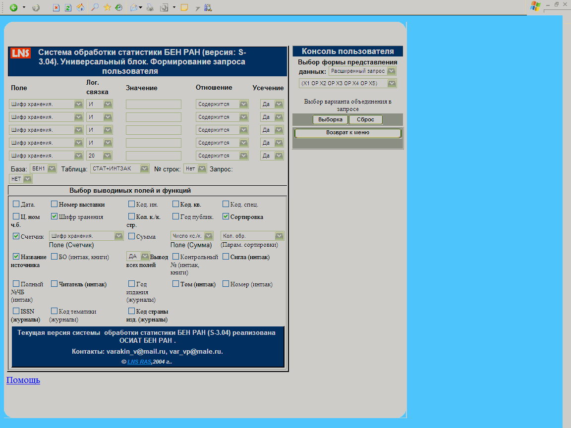 Благодаря тому, что к БД подключены элементы библиографических описаний, Система обеспечивает выполнение “прямых” и “обратных” запросов на выборку данных: “По элементам результирующих статистических таблиц найти библиографию” и “По элементам библиографических описаний найти соответствующие записи статистики и осуществить заданную обработку информации”.