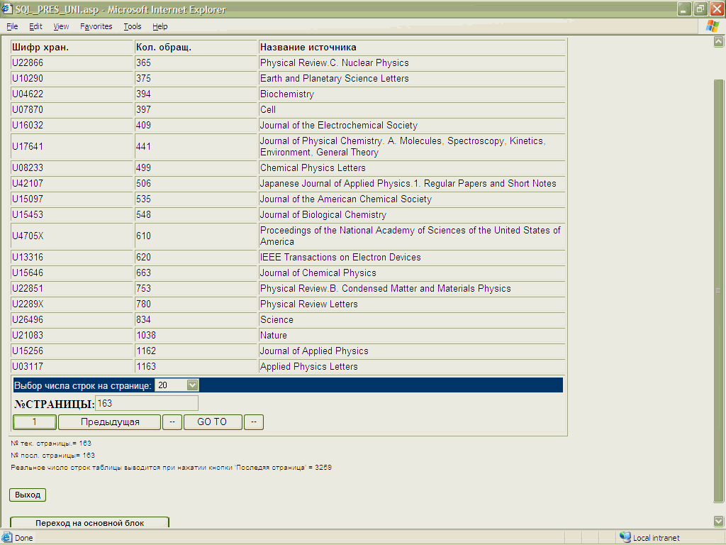 Список выводится постранично в виде таблиц, количество строк в которых можно изменить, воспользовавшись раскрывающимся списком “Выбор числа строк на странице” (1, 5, 10, 20, 50, 70, 100, 200, 300, 500, 1000, 10000, 50000, 100000). В примере системой выведена последняя страница итоговой таблицы, поэтому количество ее строк не равно 20-ти. Для перехода на требуемую страницу в поле “№СТРАНИЦЫ” вводится ее номер и нажимается кнопка “GO TO”.
