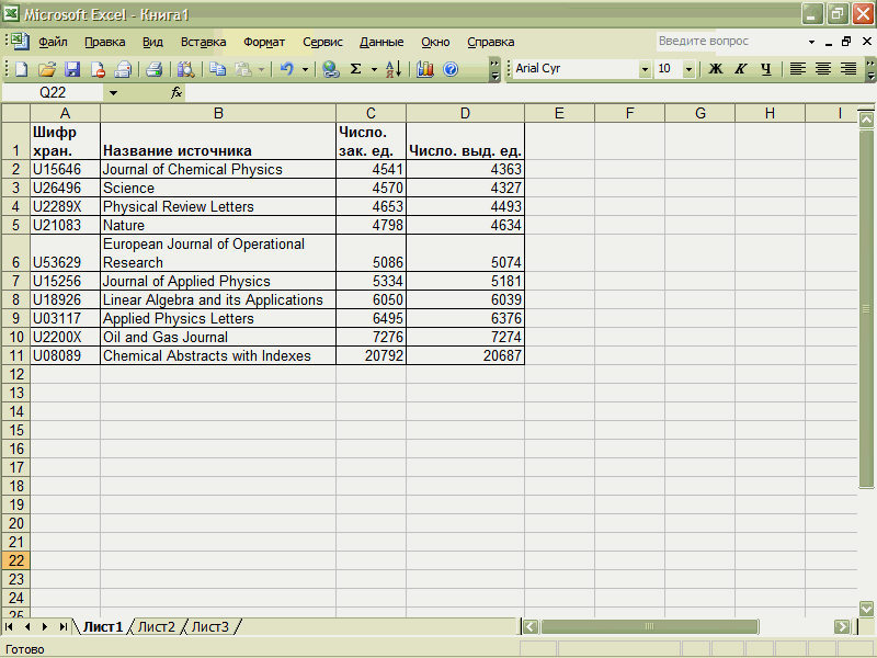 Система позволяет формулировать запросы, более “мощные” по сравнению с запросом, рассмотренным выше. В них, наряду с функциями и сортировкой, включаются поисковые значения полей (верхняя левая область формы интерфейса), соответствующая логика и операции отношения. Так, например, можно сформулировать запрос: “Сколько и каких заказано и выдано журналов за период времени 1996 -2005 г.г.” и получить таблицу, фрагмент которой выведен в EXCEL и представлен на рис.3.