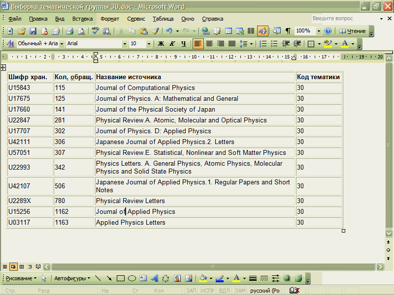 Рис.4 Результат выборки по коду тематики 30 (последняя страница результирующей таблицы сохранена в WORD)