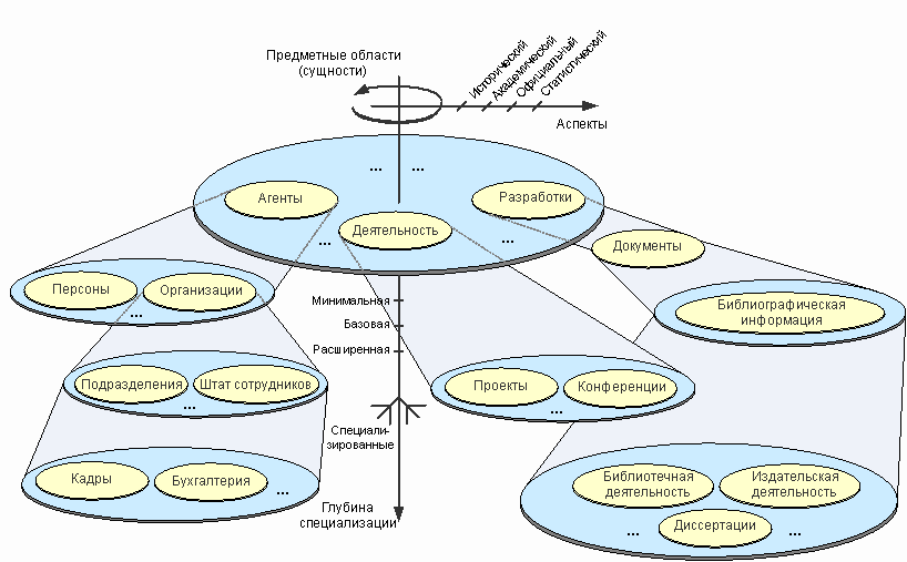 Предметные области совместно с глубиной специализации формируют своего рода иерархическое измерение. Ортогональным к этому измерению является измерение возможных аспектов описания сущностей. Помимо основного “предметного” аспекта, в базовом наборе элементов метаданных ЕНИП выделяются следующие аспекты: