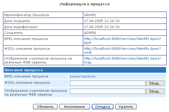 Регистрация новых описаний рабочих процессов и их размещение в репозитории системы управления осуществляется посредством административного WEB-сервиса, после чего информация о зарегистрированном процессе и списке активных экземплярах доступна для просмотра и модификации (рис.3).