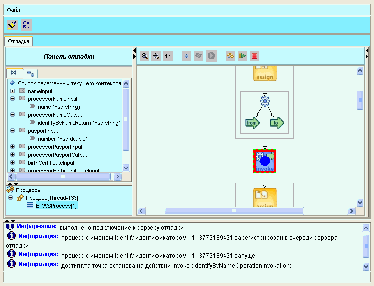 Разработанная система исполнения рабочих процессов имеет развитые средства визуальной отладки потоков работ. При этом реализована клиент-серверная архитектура, состоящая из сервера отладки, визуального клиента и XML-протокола для их взаимодействия, позволяющая выполнять полноценную отладку рабочих процессов в реальном времени (рис.5).