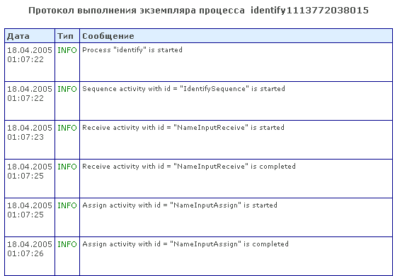Для возможности протоколирования хода исполнения рабочего процесса предназначен модуль журналирования состояний действий и исключительных ситуаций, возникающих на маршруте рабочего процесса. Доступ к журналу сообщений осуществляется через WEB-интерфейс. Фрагмент протокола исполнения рабочего процесса представлен на рис. 6.