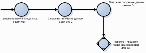 Пример процесса последовательного сбора экспериментальных данныхКаждая из групп экспериментальных установок управляется отдельным микропроцессором [9,11] и представлена снаружи Web-сервером, поддерживающим взаимодействие по протоколу SOAP. Для снятия показаний с приборов в рамках рабочего процесса происходит последовательное обращение к методам таких Web-сервисов. Полученный таким образом массив информации является входным параметром процесса первичной обработки данных.