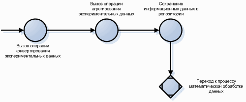 Пример простого процесса первичной обработки экспериментальных данныхНа данном этапе происходит обращение рабочего процесса к Web-сервисам конвертирования, а затем агрегирования данных, в задачу которых входит преобразование форматов данных, получаемых с различных измерительных устройств, к каноническому формату и их агрегирование [10] в соответствии с каноническим описанием (метаданными) [12]. После этого процесс обращается к Web-сервису импорта-экспорта хранилища экспериментальных данных для загрузки обработанной информации. Дальнейшая процедура анализа полученных данных – математическая обработка.