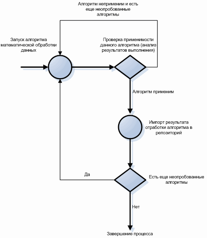 Типовая схема процесса математической обработки экспериментальных данныхДанный процесс обращается к подключаемым Web-сервисам, реализующим различные алгоритмы математической обработки экспериментальных данных. При этом на этапе контроля применимости данного алгоритма процесс может привлекать людей для формирования экспертной оценки. В случае успешной отработки алгоритма происходит сохранение результата обработки в хранилище данных посредством обращения к сервису импорта. Число подобных итераций равно числу доступных математических алгоритмов. При этом сам процесс выполнения такого алгоритма может также быть представлен в виде отдельного потока работ, выполняя, например: