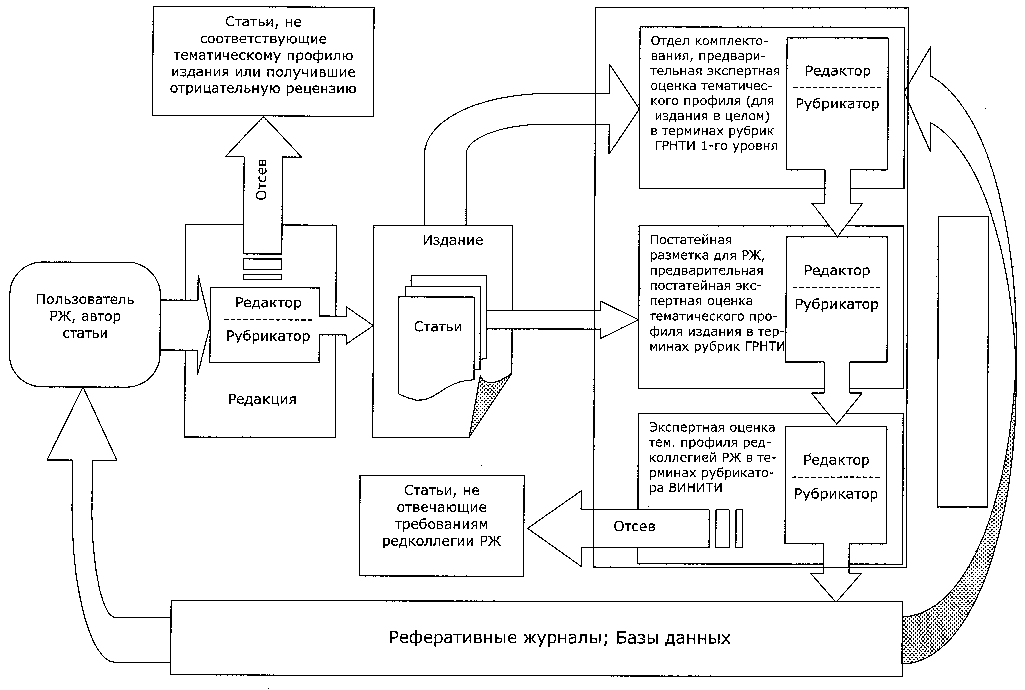 Эксперт-редактор-2 (ЭР-2). Эксперт, оценивающий тематику отдельно взятой статьи по классификационной системе путем присвоения статье индекса рубрики Рубрикатора ВИНИТИ до необходимой глубины. Предполагается, что в роли ЭР-2 выступает ученый, обладающий достаточным научным кругозором для того, чтобы на этом этапе произвести отсев статей, не соответствующих тематическому профилю вторичных информационных ресурсов или не отвечающих требованиям научного качества. То есть ЭР-2 оценивает не только тематику, но и научное качество статьи. Таким образом, в базу данных информационного центра направляется документ, описывающий тематику статьи из СИП развернутой лингвистической конструкцией, соответствующей названию рубрики, в которую документ помещен ЭР-2.