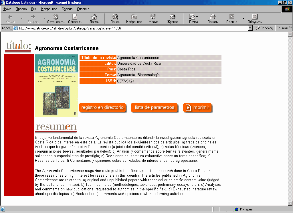 Фрагмент полного библиографического описания издания в Справочнике LATINDEX.