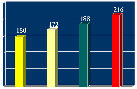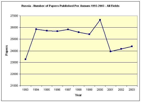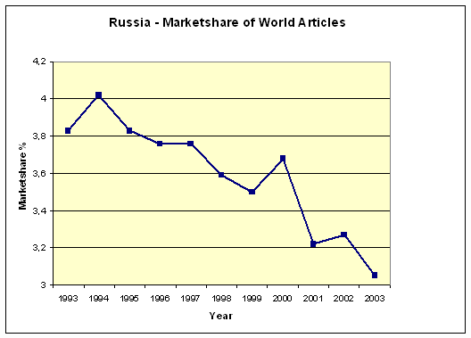 На рис.1 представлено распределение по годам количества статей, опубликованных российскими учеными в ведущих западных научных журналах. Как видно из графика, количество публикаций резко сократилось в 2001-м году. И хотя за 2001-2003 гг. несколько выросло, оно существенно ниже показателей за 1994-2000гг.