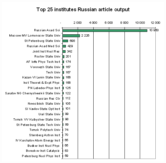 На рисунке 2 представлен список 25-ти лидирующих в этих публикациях российских организаций. Легко заметить, что количество работ, опубликованных сотрудниками РАН, почти в два раза больше, чем другими российскими учеными. вместе взятыми. Это говорит о бесспорном лидерстве академической науки в России.