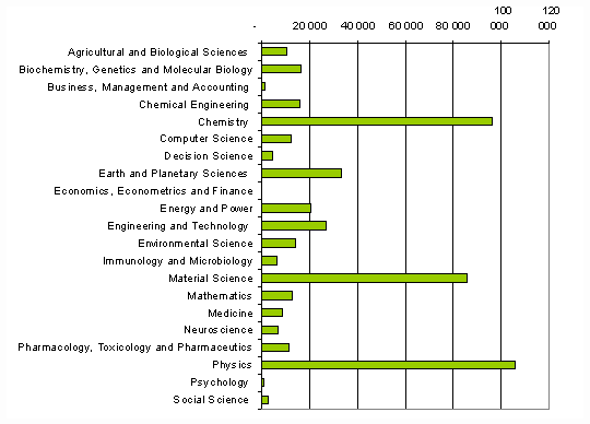 Одним из основных источников информации для российских ученых является “Научная электронная библиотека”. При этом активность ее использования весьма различна по различным областям науки. Число загрузок статей из НЭБ российскими пользователями по различным областям науки приведено на рис.5.