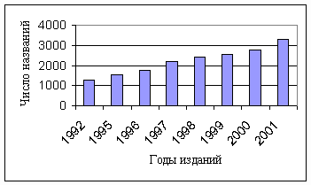 Следуя официальной статистике [1], ежегодный прирост журналов России по названиям составляет в среднем 8%. Более 70% из них - специальные и специализированные журналы, в т.ч. 50% - научные и научно-производственные, примерно 8% - информационные. То есть, из 3300 периодических изданий, учтенных РКП в 2001 г., научные и научно-производственные журналы составляют примерно 1,6-1,7 тыс. названий. По совокупности данных объем потока периодических и продолжающихся изданий составляет более 4 тыс. названий (28 тыс. экземпляров). Из них периодических изданий – 2,2 тыс. названий. Продолжающиеся и периодические издания по естественным, техническим наукам, сельскому хозяйству и медицине составляют примерно 2,5 тыс. названий, из них журналов – 1,8 тыс. названий.