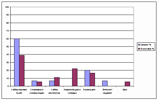 По этому распределению видно, что в отличие от выдачи поисковой машины, в выдачу каталога очень маловероятно попадание “шума” по рассматриваемой тематике. Кроме того, в ней отсутствуют сайты энциклопедий и словарей, т.к. в их каталожном описании отсутствует слово–запрос “fullerene”. Однако в выдаче представлен раздел “Интернет издания”, в этот раздел мы включили сайт, содержащий множество ссылок на сайты, посвященные фуллеренам.