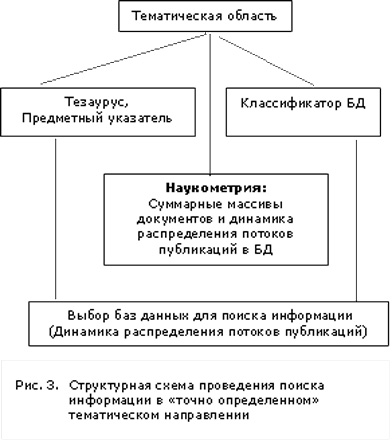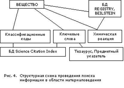 Новые возможности поиска информации по свободным или контролируемым терминам, кодам классификаторов БД и др. с целью сопровождения исследований диктуют необходимость проведения аналитической работы, используя основные возможности наукометрии. Информационная поддержка любой научной работы должна строиться на предварительной наукометрической информации о состоянии исследований или разработок по рассматриваемому тематическому направлению. Последняя включает работу с тезаурусами или списками контролируемой лексики по интересующему вопросу, изучение Классификаторов БД для определения возможных узко-тематических направлений изучаемой проблемы, и, наконец, выбор баз данных, отражающих различные аспекты исследования или разработок с учетом накопленных ретрофондов. На рис. 3 и 4 предлагаются структурные схемы для ведения поиска информации в определенном тематическом направлении по науке и технике, и отдельно по материаловедению, имеющему свою специфику, связанную с химическими формулами веществ (рис.4). Рассмотрим несколько примеров, иллюстрирующих предложенные структурные схемы.