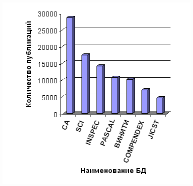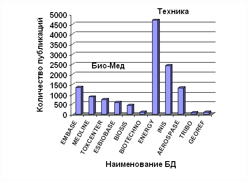 На гистограммах суммарных массивов публикаций в политематических и специализированных БД по одному из приоритетных направлений 21 столетия – фуллеренам (новой формы углерода), открытых в 1985 г. коллективом ученых: H.W. Kroto (Великобритания, Сассекский университет), J.R. Heath, S.C. O`Brien, R.F. Curl, R.E. Smalley (США, университет Райса) – Нобелевская премия 1996 г., хорошо прослеживаются отмеченные выше основные направления исследований по политематическим БД (СА – БД США с преимущественным отражением химической тематики, INSPEC – БД Великобритании с преимущественной направленностью в области физики; COMPENDEX – БД США, отражающая проблемы техники и технологии; PASCAL – БД Франции, тематические приоритеты в которой – физика, химия и биология и SciSearch (SCI) – БД США по точным и естественным наукам), и области применения по специализированным БД.