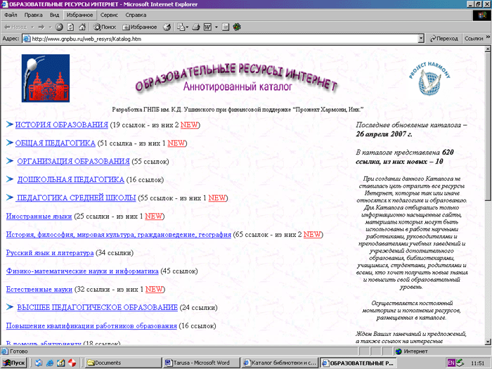 Работа над ним начата в 2002 году. В настоящее время он насчитывает более 600 ссылок на русскоязычные образовательные ресурсы, которые размещены в каталоге в соответствующих рубриках. Рубрикатор каталога построен по подобию рубрикатора периодического издания библиотеки “Литература по педагогическим наукам и народному образованию”. Помимо пополнения каталога, происходит постоянный мониторинг ресурсов, уже внесенных в каталог. При этом вносятся необходимые изменения, если меняются адреса ресурсов или их тематика, и удаляются недействующие ссылки. В планах работы над развитием Каталога — создание раздела, посвященного наиболее значимым зарубежным ресурсам по педагогике и образованию, а также раздела, в котором будут представлены библиотеки электронных текстов.