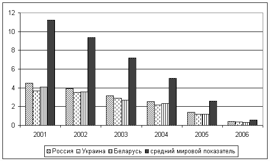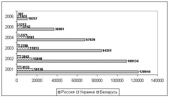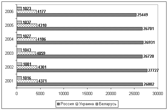 Рис. 1. Количество публикаций 2001-2006 гг. Россия, Украина, Беларусь