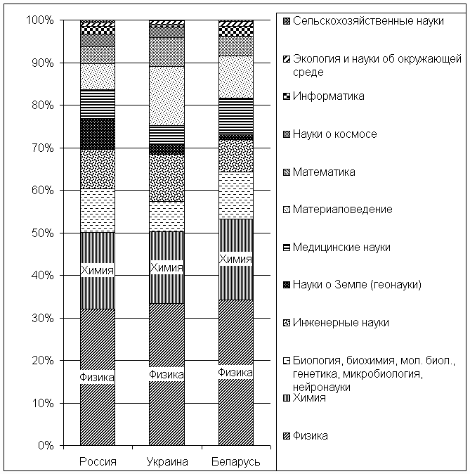 Как видно из рис. 4, во всех трех странах наиболее приоритетными являются физика (чуть более 30% от общего количество статей) и химия (чуть менее 20% от общего количества публикаций). На третьем месте по значимости в России и Беларуси — биологические науки, на Украине — материаловедение.