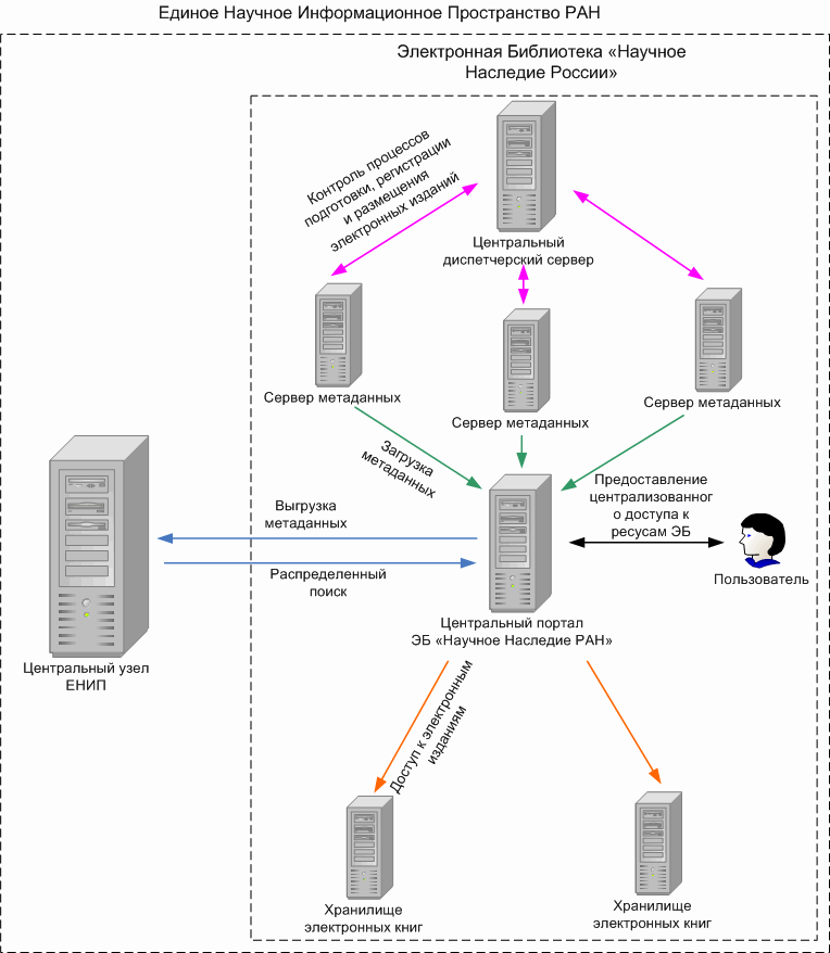 На следующей диаграмме приведена общая архитектура распределенной системы электронной библиотеки и схема ее интеграции в ЕНИП РАН: