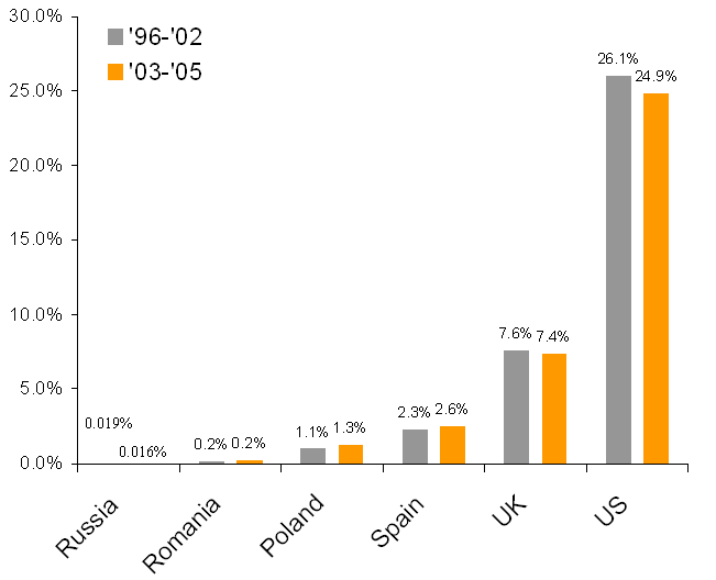 Так, доля России в количестве статей, индексируемых в Scopus, составляет всего 0.016%, в то время как доли США и Великобритании стабильно высоки. Польша и Испания сокращают отставание от Великобритании по числу опубликованных в мире статей, в то время как Россия уступает по этому показателю даже Румынии. США же и Великобритания приносят 32.3% всех научных публикаций представляя всего 5.5% населения мира.