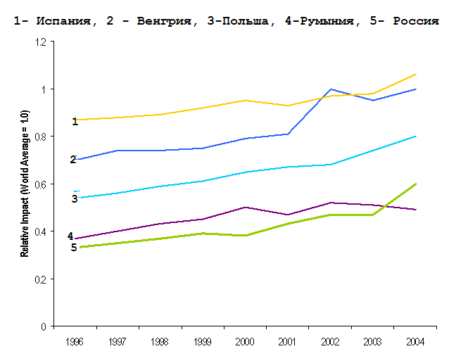 Но если эти данные сравнить с динамикой развития среднего уровня цитируемости авторов некоторых других стран (Венгрии, Польши, Испании), то показатели российских авторов — заметно ниже.