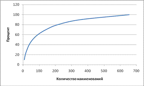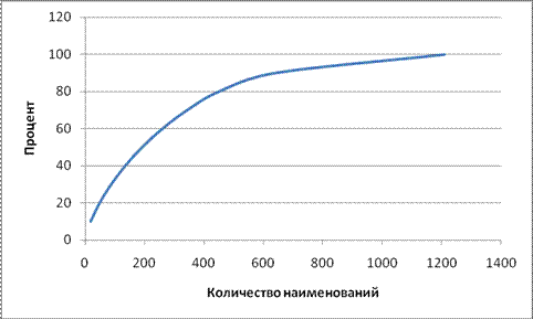 Полученная таблица также обладает ядром, 50% всех заказов приходятся на 59 наименований, а 2/3 заказов – на 125 наименований. Процентное распределение суммы полученных заказов в зависимости от числа наименований заказываемых журналов приведено на рис.2.