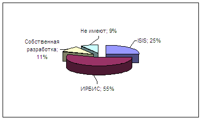 Библиотеки, работающие в контакте с ГПНТБ СО РАН, используют программный пакет CDS/ISIS, он установлен на ПК библиотек СО РАН, составляющих 25%. общего числа. Наиболее востребованным ПО в библиотеках является "ИРБИС", его используют в работе 55% библиотек. Одиннадцать процентов библиотек применяют собственные программные разработки, но они, как правило, не совместимы с автоматизированной библиотечно-информационной системой методического центра; шесть (9%) библиотек не имеют ПК и, следовательно, библиотечных программ.