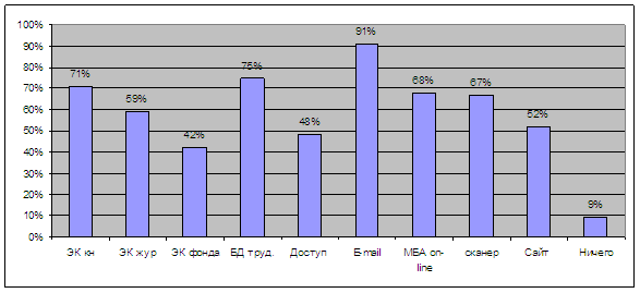 Наиболее распространённым автоматизированным процессом в библиотеках сети СО РАН является создание БД трудов сотрудников НИУ, его осуществляют 75% библиотек; электронные каталоги книг (ЭК кн) генерируют 71% библиотек, ЭК журналов – 59% библиотек; ЭК всего фонда – 48%, доступ через Интернет к ЭК имеется также в 48% библиотек. Электронные каталоги представлены составными частями в распределенном корпоративном каталоге библиотек Сибири, доступ к которому организован на сервере СО РАН. Услугу оперативного заказа литературы по МБА в режиме on-line предоставляют своим пользователям 68% библиотек, а возможность сканирования для электронной доставки документов (ЭДД) имеют – 67% библиотек. Электронной почтой пользуется 61 библиотека (91%), библиотечные сайты открыты в 52% библиотек, однако не все из них поддерживаются постоянно. Информация на сайтах представлена, в основном: каталогами, оглавлениями научных журналов; аннотациями и рефератами статей; полнотекстовыми БД; бюллетенями новых поступлений; БД трудов сотрудников. Наблюдается ежегодное увеличение числа обращений пользователей к сайтам библиотек, к базам данных собственной генерации, а также к проблемно-ориентированным базам данных по Сибири и Дальнему Востоку.