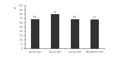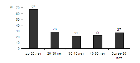 В ходе анкетирования было выявлено, что четвертая часть опрошенных не использует сайт БЕН РАН. Данная категория респондентов была проанализирована с учетом их принадлежности к определенной возрастной группе (рис. 1). Наименьшее значение этого показателя зафиксировано в возрастной категории «30-40 лет» - только 21% опрошенных данной категории не использует ресурсы, представленные на сайте БЕН РАН. Самый большой процент (около 30%) респондентов, не использующих сайт БЕН РАН, отмечен у пользователей в возрасте до 30 лет (совокупное значение категорий «до 20 лет» и «20-30 лет»).