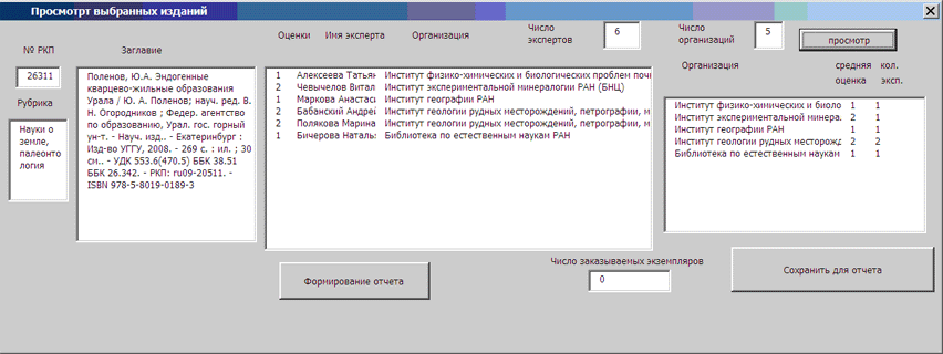 Система предоставляет специалистам-комплектаторам в удобном виде подробную информацию об издании: номер Российской книжной палаты, название книги с кратким библиографическим описанием и указанием рубрики, к которой она относится. Одновременно отражаются данные об экспертах: общее количество экспертов, принявших участие в оценке издания, ФИО каждого из них с указанием института, в котором он работает, оценка каждого эксперта, средние оценки и т. д.