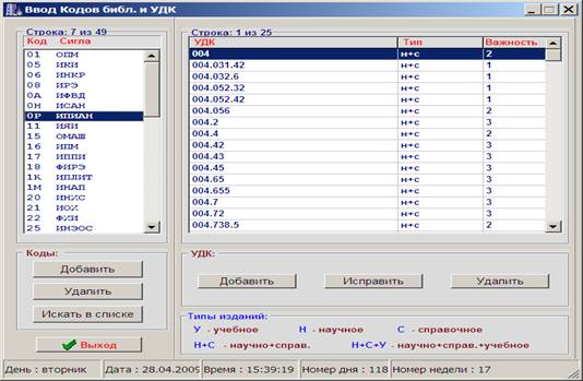 Рис.1. Окно ввода кодов библиотек и УДК.