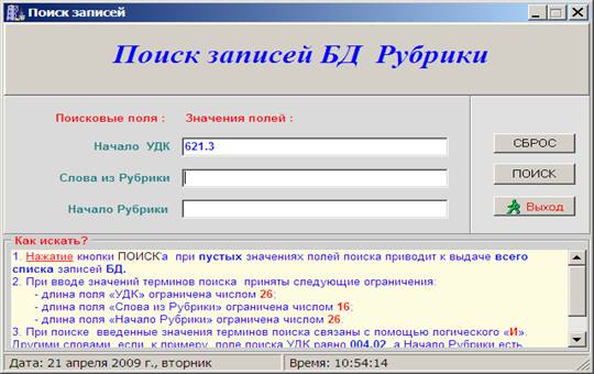 Нажатие кнопки «Поиск» при пустых значениях полей поиска приводит к выдаче всего списка записей БД. Отрицательный результат поиска сопровождается соответствующим коротким сообщением. Эта ситуация возникает при неправильном вводе запроса, а также при отсутствии данного индекса или рубрики в сводном ТТПК ЦБС БЕН РАН.