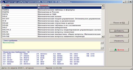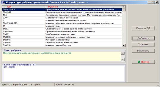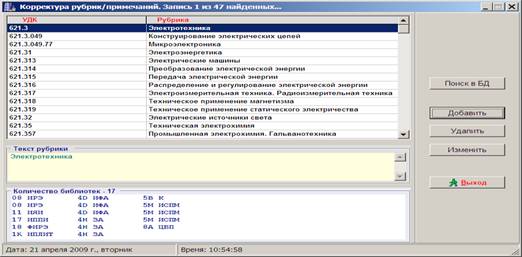 Результат поиска можно увидеть на Рис.3. В окне «Корректура рубрик/примечаний» указаны индексы УДК с соответствующими им Рубриками. В графе «Текст рубрики» отразится полный текст рубрики, выделенного индекса УДК. Информацию о библиотеках, в ТТПК которых присутствует искомый УДК, комплектатор увидит в нижней части этого окна. Основываясь на результате этого поиска, комплектатор может точно определить в какие библиотеки нужно отправить литературу по этой тематике. К сожалению, степень важности издания для каждой библиотеки можно определить, только вернувшись в окно «Ввод кодов библиотек и УДК».