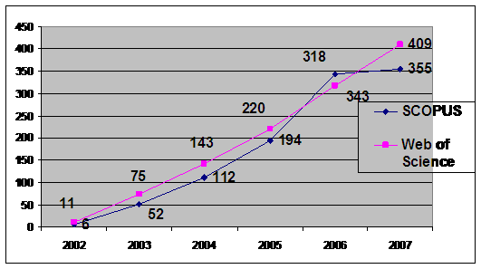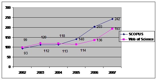 Библиометрический анализ публикационной активности ученых Уральского отделения РАН проводился на массиве документов, включенных в БД Web of Science и SCOPUS за период с 2002 по 2007 гг. 1