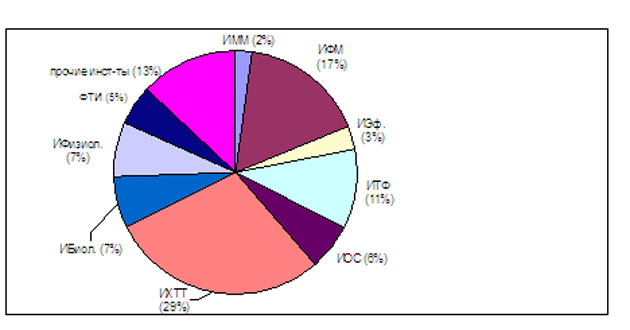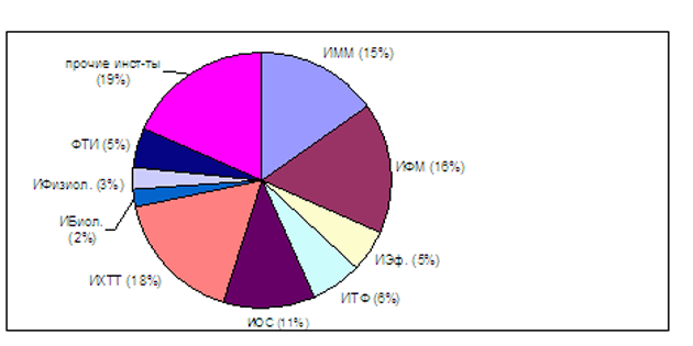 Институт математики и механики УрО РАН имеет высокий процент публикаций, но при этом очень низкий процент цитируемости. В качестве самого продуктивного по количеству публикаций следует отметить Институт химии твёрдого тела УрО РАН (на 118 публикаций приходится 311 ссылок). Процент цитируемости в данном случае достаточно сильно превышает процент публикаций. Достаточно серьёзный вклад внёс Институт физики металлов УрО РАН, имеющий высокие показатели, как по количеству публикаций, так и по количеству ссылок